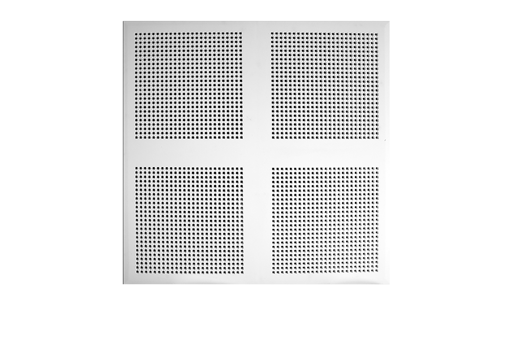 A plaster acoustic panel with circular perforations 45mm at 85mm centres, forming a continuous pattern when joined.