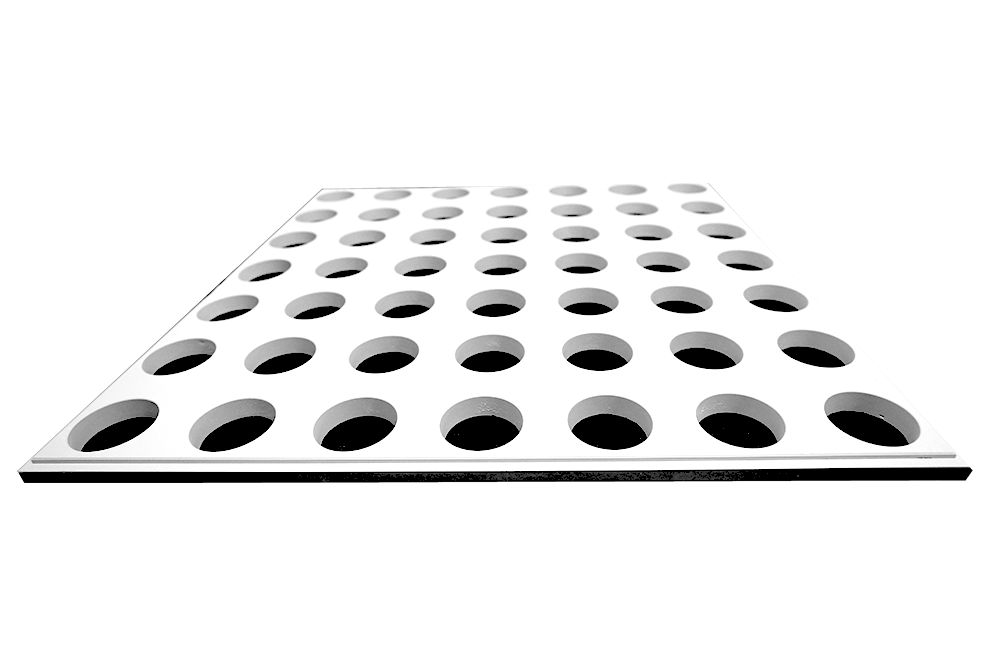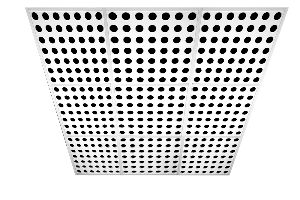 To be used in conjuction with exposed ceiling grid: 24 mm T Bar steel or aluminum 600 x 600 system.