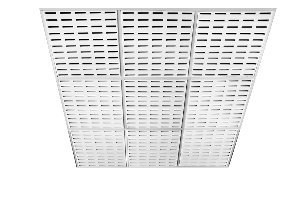 To be used in conjuction with exposed ceiling grid: 24 mm T Bar steel or aluminum 600 x 600 system.